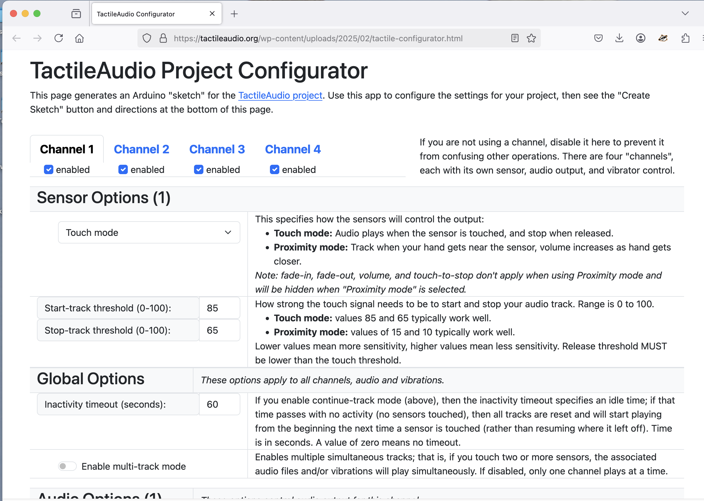 The heart of a TactileAudio device is a computer, but you don't need to write any computer code. The “Configurator” web app provides an easy way to create the Arduino software ("sketch") necessary to run your project. While you might be able to write Arduino software on your own, the Configurator provides graphical ways to customize the interactivity of your project. It creates the software that you can paste into the Arduino app.