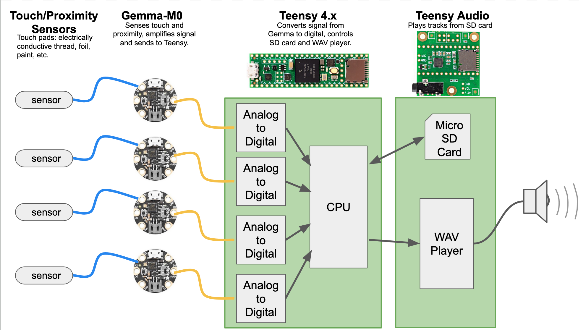 The TactileAudio is a device that uses capacitive (touch/tactile or proximity) sensing to trigger fixed audio files and/or trigger haptic vibrations. You design and create tactile sensors that fuse touch (passive haptics) and listening to deepen and embody listening.
