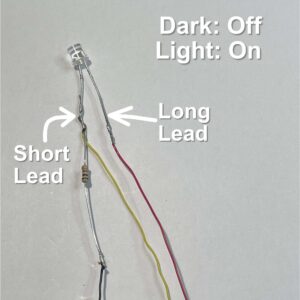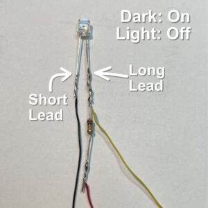- Hold the resistor and the stripped end of the yellow wire together, and wrap them around lead of the phototransistor (short or long lead, depending on your configuration; see Figures 1 and 2 above). Solder the resistor and yellow wire to the phototransistor.
